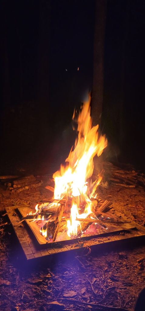 Each night, we relaxed by the campfire, listening to the audiobook We Are Legion (We Are Bob) by Dennis E. Taylor. It was the perfect companion for those cool evenings, drawing us into a clever sci-fi adventure while the fire crackled. There’s something so peaceful about sitting by the fire, wrapped in a blanket, letting the story unfold with the stars overhead.